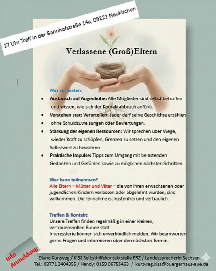 Dann melde dich gern bei der Selbsthilfekontaktstelle im Erzgebirgskreis. Frau Kurzweg per E-Mail: kurzweg.kiss@buergerhaus-aue.de oder per Tel. 03771/20303 / Handy 0159/06755463